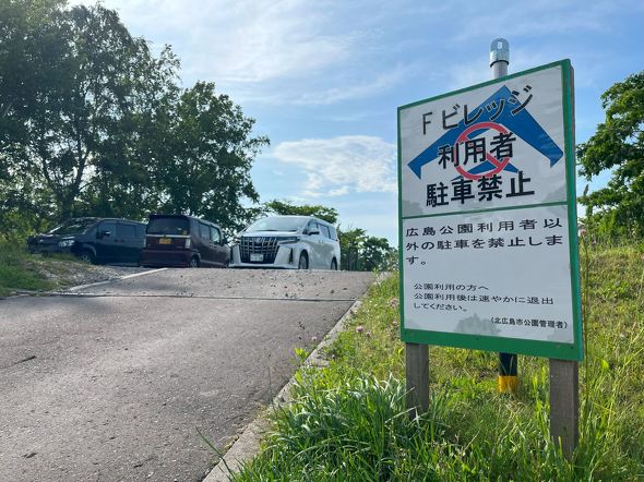 その近くには「無断駐車禁止」と書かれた看板も。看板には「北ひろしま福祉会の私有地につき、無断駐車禁止です。駐車許可証のない車両はレッカー移動します」と書かれていた。付近には北ひろしま福祉会の本部や、運営する障がい者福祉施設「北広島コラボ」が所在する。Fビレッジ周辺の迷惑駐車が、全く関係のない施設にも及んでいると推察できた。