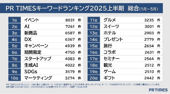 2025年上半期総合では、1位が「イベント」(8031件)、2位が「AI」(7261件)、3位が「新商品」(6587件)だった。月別のランキングでは、5月にはAIがトップとなり2年1カ月振りにイベントが1位の座から下りた。