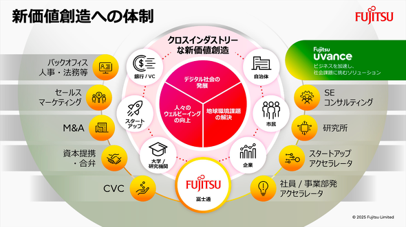 しかし、これらの課題は一企業だけで解決できるものではない。だからこそ富士通は、スタートアップ、銀行、アカデミア、企業、市民、自治体といったさまざまなステークホルダーと連携し、業界や領域を横断する「クロスインダストリー型の新たな価値創造」に取り組んでいる。