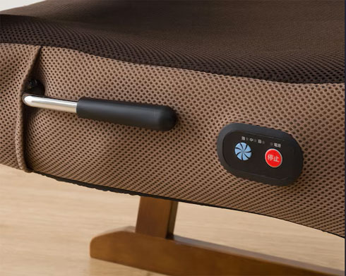 空気が通る高座椅子は、座面と背もたれに4個ずつのファンを内蔵。側面のスイッチを入れるとクッションの中を風が通り、体熱で温まった空気や湿気を放出する。風量は3段階で調整が可能。電気代は1日約2.3円(1日8時間使用、1kwh単価31円で計算)。
