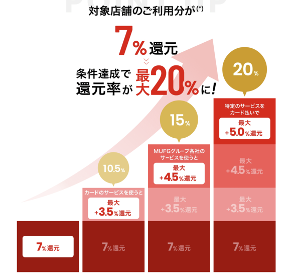 一方、三菱UFJのエムットには、Oliveの設計を徹底的に研究した形跡が見える。基本設計は驚くほど類似しており、対象店舗での7%還元を土台に、グループサービス連携による段階的な上乗せで最大20%を実現する。