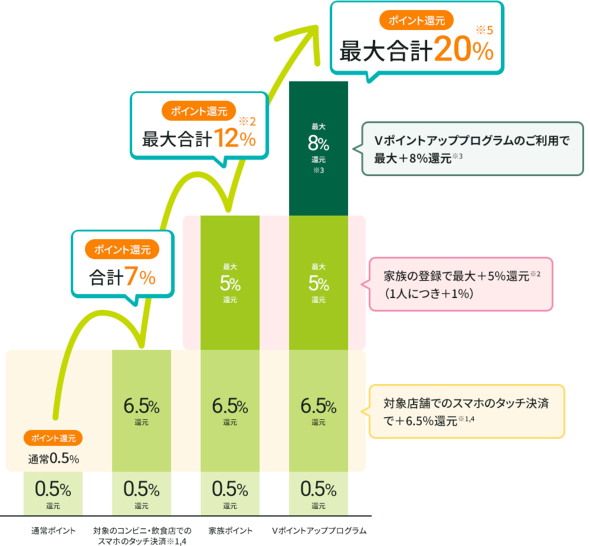 両社の「20%還元」はどのような仕組みで実現されるのか。Oliveの還元率は階段構造で設計されている。基本還元率0.5%からスタートし、対象店舗でのスマホタッチ決済により6.5%が上乗せされ、計7%となる。ここにVポイントアッププログラムの最大8%、家族登録による最大5%(1人につき1%)、各種サービス利用による最大3.5%が加算される仕組みだ。