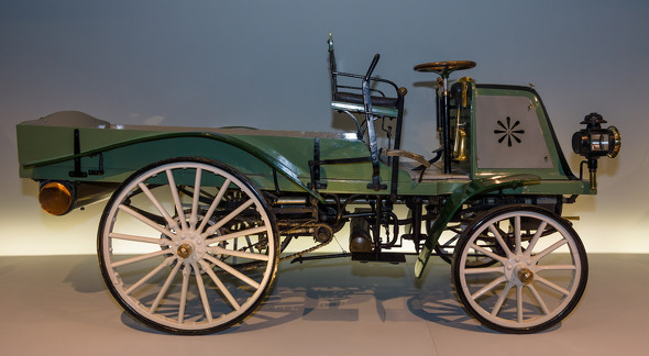 1899年製のダイムラーのトラック。後輪の内側にある白い輪にレザーベルトが巻き付けられており、運転席横のレバーを引くことでベルトの張力が高まり制動力を発揮する(写真:Sergey Kohl - stock.adobe.com)また、馬車時代から使われていた車輪の外側、すなわちタイヤ表面にパッドを押し当てる、かなりシンプルかつ強引なシステムで、制動力もさほど期待できないブレーキも存在した。その頃は速度が自転車程度であったことに加え、他の交通手段が少なく、道路も未舗装で転がり抵抗が大きかったため、ブレーキに対する要求は高くなかったようである。