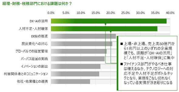 経理・財務・税務部門全体における重要な経営課題について聞くと、「DX・AI活用」(38.8%)と「人材育成・人材確保」(35.7%)が上位を占めた。