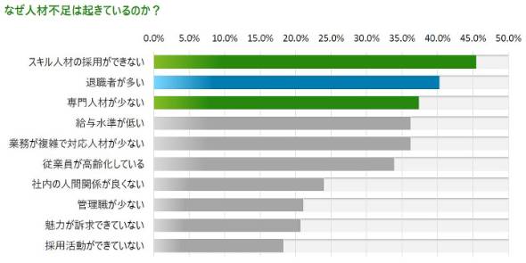 人材不足の理由については、「スキル人材の採用ができない」(45.5%)、「専門人材が少ない」(37.4%)が上位に。単なる人材不足ではなく、高度なスキルを持つ人材の確保が困難になっているようだ。