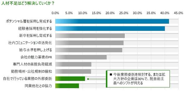人材不足の解決策については、「ポテンシャル層を採用し育成する」(41.6%)が最も多く、「経験者採用を強化する」(40.1%)が続いた。一方「自社業務の外部委託」(10.9%)や「同業他社との協力」(8.7%)など、外部との連携による打開策は少数にとどまっている。
