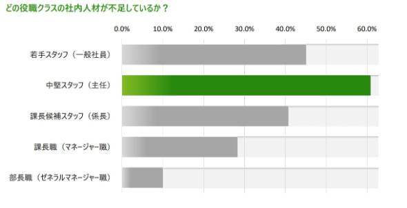 どの役職クラスの社内人材が不足しているかについては、「中堅スタッフ」が60.9%に上った。将来の課長・部長クラスを担う存在であるだけに、中堅層の不足は、経理・財務・税務人材の枯渇にもつながりかねない。