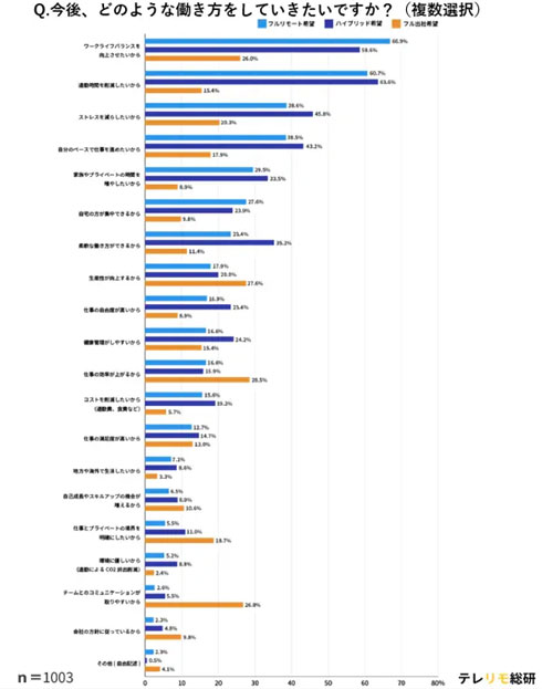 フルリモート勤務やハイブリッド勤務を望む人からは、「ワークライフバランスを向上させたい」「通勤時間を削減したい」「ストレスを減らしたい」といった声が寄せられた。仕事だけではなく、生活全体を重視している様子がうかがえる。