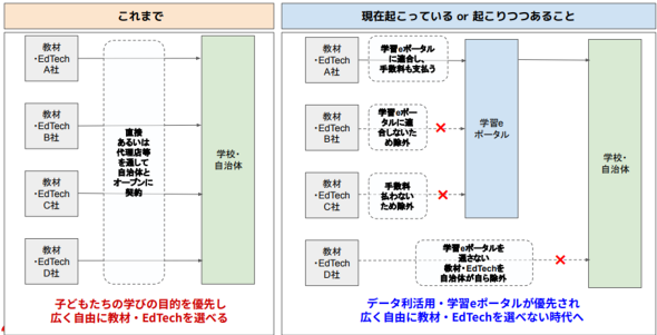 一番の問題は、自治体や学校が広く自由に教材・EdTechを選べなくなる状況になりつつあることです。これまではGIGAスクール構想の目的にもあるように「多様な子どもたちを誰一人取り残すことなく、公正に個別最適化され、資質・能力が一層確実に育成できる教育環境を実現する」ために、多様な教材やEdTechを自治体・学校は広く自由に選択できてきました。