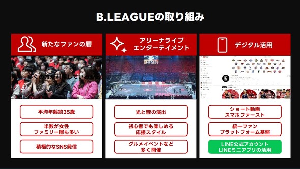 創設10周年を迎えるBリーグは、2023〜2024年の売上高が632億円と過去最高を記録。人気は、うなぎのぼりだ(以下クレジットのない資料は「Hello Friends! W!th LINEヤフー」提供)これを実現した取り組みの1つとしてLINEを使った顧客体験DXがある。Bリーグは注力した取り組みとして「新たなファンの層」「アリーナライブ エンターテインメント」「デジタル活用」の3つを掲げた。デジタル活用においては「LINE公式アカウント」と、LINEアプリ上で店内オーダーや会員証などの機能を提供できるサービス「LINEミニアプリの活用」を挙げている。