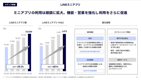 こういった取り組みにより、LINEミニアプリの利用者がさらに増加すれば、LINE上でのユーザーの滞在時間が増え、LINE自体のメディア・媒体としての価値向上も期待できる。最終的には、広告の売り上げ増加にまでつなげることによって、対価を得ようという考えがベースにあるようだ。
