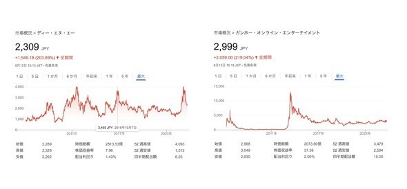 DeNAと、同じくスマホゲームで躍進したガンホーの長期株価チャートを比較してみよう。足元の時価総額は同じ2000億円台で推移しているが、ガンホーの株価の乱高下ぶりには目を見張るものがある。パズドラブームに沸いたガンホー株を2013年に取引した投資家の中には億万長者になった者もいるだろうが、高値でつかんでしまった投資家の中には莫大な損失を抱えたり、含み損のまま保有を余儀なくされた投資家も大量に発生した。