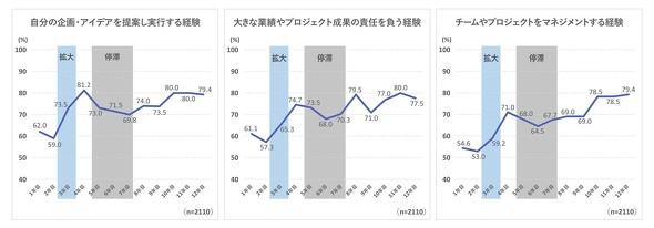仕事の内容や幅を自ら広げようとする行動も、「3年目」と「5〜7年目」で低下する傾向があった。