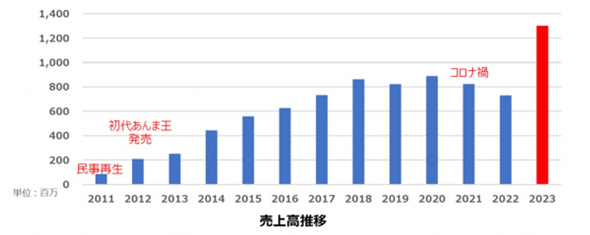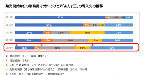 発売以降、コロナ禍があったものの、売り上げは堅調に推移している。業務用のマッサージチェアは毎年買い替える製品ではないが、「あんま王」シリーズでは、「あんま王2」から最新機種の「あんま王4」への買い替えと、新規施設への導入が同じ時期に重なった。これにより、2023年の売上高は前年比1.7倍となり、過去最高を記録した。