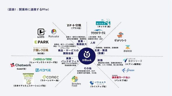 7月24日の開業記者発表会では、01Bankの伊東眞幸社長(中央)と連携する20社のプラットフォーマー代表者が集まった。マクアケ、Zaico、チャットワーク、クラウドワークスなど多様なSaaS事業者が参加し、データ活用による新たな金融エコシステム構築への意気込みを示した同行の成功を左右する第一のカギは、プラットフォーマーとの連携拡大にある。現在の連携先約250万社から、3年後には30社程度のプラットフォーマーと組み、総利用先数を約360万社に拡大する計画だ。