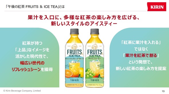 キリンビバレッジは8月26日、「キリン 午後の紅茶」ブランドから、新シリーズ「午後の紅茶 FRUITS & ICE TEA」を発売すると発表した。ラインアップは「オレンジとグレープフルーツ」「白ぶどうとレモン」の2種類で、希望小売価格は税抜き180円。9月23日から販売を開始し、普段紅茶を飲まない層を取り込む狙いだ。