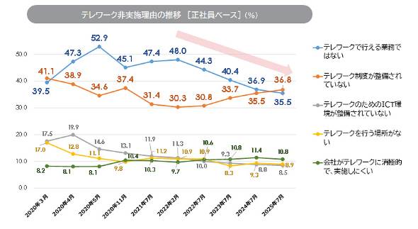 テレワークを実施していない理由については、「テレワーク制度が整備されていない」(36.8%)という回答が2022年2月から継続的に上昇しており、「テレワークで行える業務ではない」(35.5%)を上回った。