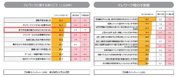 テレワークでの困りごとについては、1位が「運動不足を感じる」(55.4%)、2位が「テレワークでできない仕事がある」(42.4%)だった。3位の「部下の仕事の様子が分からなくなった」(36.5%)については、ここ2年間で増加傾向にある。