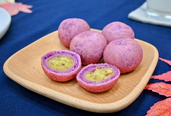 さつまいもを使用したスイーツとドリンクも復活販売する。昨年約2カ月で累計85万食を売り上げた「熱々 おさつボール」(3個入り280円、5個入り460円)は、徳島県産の「なると金時」を使用したさつまいも餡を、紫芋パウダーを練りこんだ生地で包んだ商品だ。商品開発部の青山哲久氏は同商品について「昨年は想定外の売れ行きによって欠品した反省を踏まえ、今年は供給体制を強化した」として、安定した提供を目指すとしている。