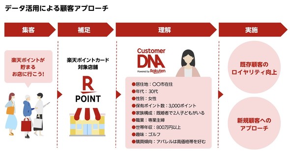 データ活用の流れは、次の通りだ。楽天市場での検索履歴や購入商品、楽天トラベルでの宿泊先、ポイント加盟店での購買履歴などの行動データを収集。これらを統計処理し、「30代女性、既婚者で2人の子どもがおり、ペットを飼っていて、世帯年収は800万円以上」といった属性フラグを付与する。