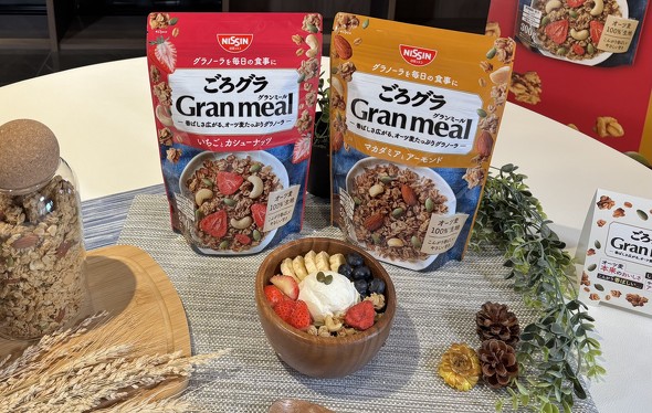 実際に、従来の「ごろっとグラノーラ」シリーズについては、消費者から「甘い」「お菓子のよう」といった声が寄せられており、同社の調査でもグラノーラを食べなくなった理由の13%が「糖分や甘さが気になる」だったという。これを踏まえ、ごろグラ Gran mealでは、オーツ麦主体の生地にナッツペーストを練り込んで甘さ控えめに仕上げた。