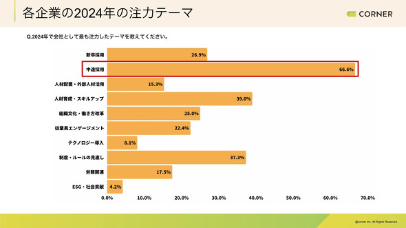 こうした人手不足の時代に企業の人事部門はどのようなテーマに注力しているのか。コーナーが2024年末に企業の経営・人事部門を対象に実施した「採用の施策振り返り調査」(外部リンク)によると、企業が今最も注力しているテーマは「中途採用」で、「人材育成・スキルアップ」「制度・ルールの見直し」がそれに続く。