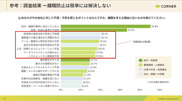 採用だけ工夫すればいいかと言えば、もちろんそうではない。潜在的な離職リスクは常に付きまとう。コーナーが2025年5月に実施した「静かな退職と人事の認識ギャップ調査」では、調査対象(従業員数100人以上の企業に在籍1年以上の正社員413人)の約4割が「静かな退職(退職離職を考えていないものの仕事に対して消極的)」状態にあることが明らかになっている。離職を考える理由を聞くと、給与や制度面だけでなく組織への信頼や仕事の中身・成長の機会に関する不満も少なくないことが分かる。