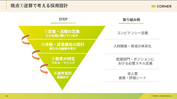 門馬氏は「このような判断は人事だけでも現場だけでも完結しません。経営と現場と人事で適切に連携し、この先1年2年3年でどのような役割やスキルが必要になるのかを具体化していくこと。その上で採用要件については定義から逆算して落とし込むことが大切です」と語る。