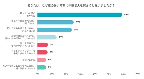 ファミリーマートが7月に実施した調査によると、暑い日に中華まんを購入する理由で最も多かったのは「小腹がすいた時のおやつ」(59%)だった。「素早く食べられ、朝ごはんに」(25%)や「忙しくても片手で食べられ、お昼ごはんに」(24%)といった“時短需要”も目立った。
