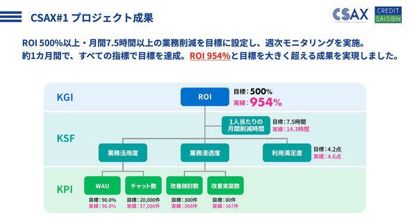 6月から8月にかけて実施した「ChatGPT Enterprise」の試験導入では、当初250人を想定していたが、315人が参加を希望した。結果は期待を大きく上回る。目標のROI(Return on Investment:費用対効果)500%に対し、実際には954%という驚異的な投資対効果を記録した。月間7.5時間以上の業務削減目標も約1カ月で達成し、実績は14.3時間と倍近い成果を上げた。