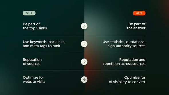 まず、SEOにおいて重要なのは検索上位に自社サイトを表示することだったが、AEOではAIによる答えの一部になることが求められる。SEOでは「トラフィック量」を目標としていたが、AEOでは「コンバージョン」が目標となる。