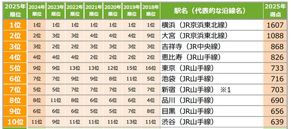 2025年のランキングによると、首都圏の1位は横浜(JR京浜東北線)、2位は大宮(JR京浜東北線)、3位は吉祥寺(JR中央線)と、主要路線の主要駅が上位を占めた。以降は恵比寿、東京、池袋、新宿、品川、目黒、渋谷と続き、10位まではJR山手線の駅が並んでいる。