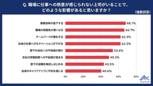 仕事への熱意が感じられない上司が職場にいることの影響としては、「業務効率が低下する」(68.1%)が最も多かった。「職場の雰囲気が悪くなる」(66.7%)、「チームワークが悪化する」「自身の仕事へのモチベーションが下がる」(ともに62.3%)が続いた。