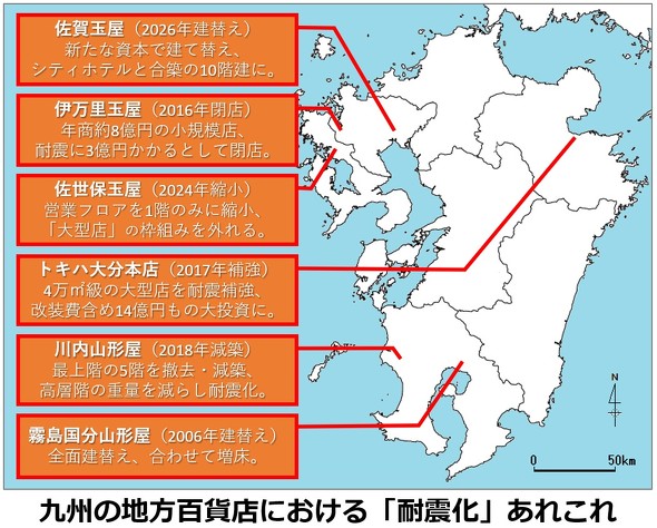 それ以降は「耐震化できない」ことを理由に閉店する大型店が相次ぐようになっており、例えば佐賀県伊万里市にあった「伊万里玉屋」(佐世保玉屋伊万里支店)は、2014年度の年商が約8億円だったのに対して、耐震補修には3億円以上かかるとして2016年に閉店している。