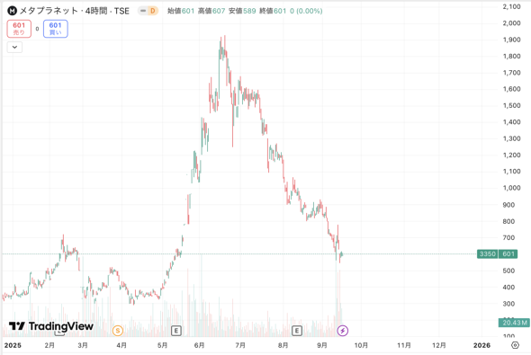 同社はビットコインを企業の財務資産とする大胆な「ビットコイントレジャリー戦略」を掲げ、株価は急騰。6月19日には最高値である1930円を記録し、時価総額が約1兆1600億円まで達していた。