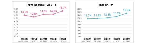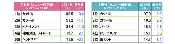 ツヤのあるストレートヘアの需要増は、美容室市場でも同様だ。リクルートの調査研究機関「ホットペッパービューティーアカデミー」による「美容室・理容室の利用に関する実態調査」によれば、女性の1年以内のメニュー利用率がカットやカラーはマイナスになるなか、「縮毛矯正・ストレート」のスコアが3年連続で増加した。