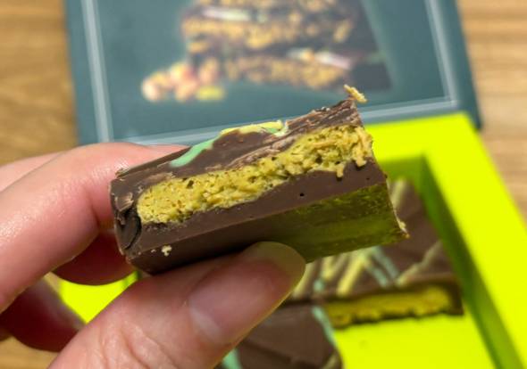 板チョコの中に、ピスタチオクリームとカダイフ(またはカダユフ、小麦粉やトウモロコシ粉でできた極細麺)をフィリングしたチョコレートで、断面の鮮やかな緑色や、カダイフによるザクザクとした食感が特徴だ。