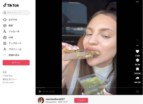 トレンドの火付け役は、ドバイのインフルエンサーによる2023年12月のTikTok投稿だ。チョコを割ったときの鮮やかな緑色の断面や噛(か)んだ時のザクザクとした咀嚼(そしゃく)音が、大きく注目された要因とされる。同投稿は、現時点で730万の「いいね」が付いている。