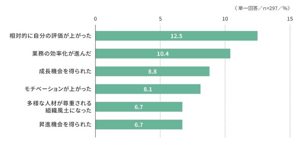 一方、恩恵を受けた理由では、「相対的に自分の評価が上がった」(12.5%)が最多で、「業務の効率化が進んだ」(10.4%)、「成長機会を得られた」(8.8%)、「モチベーションが上がった」(8.1%)が続いた。自由記述では、「仕方なく動いていた自分に評価の目を向けられた事例があるから」「自分も適度に息抜きしようと思って気が楽になった」といった意見があった。