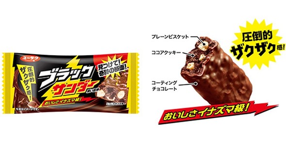 ブラックサンダーは有楽製菓最大のヒット商品であり、チョコレート市場の売り上げ個数ブランドでもナンバーワン(インテージ調べ)の商品だ。その特徴は、ココアクッキーとプレーンビスケットをチョコレートでコーティングしたザクザク食感である。