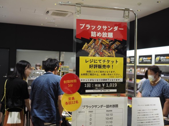 第2工場に併設する直営店「ワクザクSHOP」も好調で、従来の売店と比べて売り上げは2倍に伸びた。目玉コンテンツは、3分間で詰め放題のブラックサンダーの袋詰め(1100円)だ。1個43円で計算した場合、26個以上で元が取れる計算だが、多くの客は40個前後詰めるそうだ。筆者も挑戦してみたが、詰められたのは30個。不器用さを露呈する結果となった。