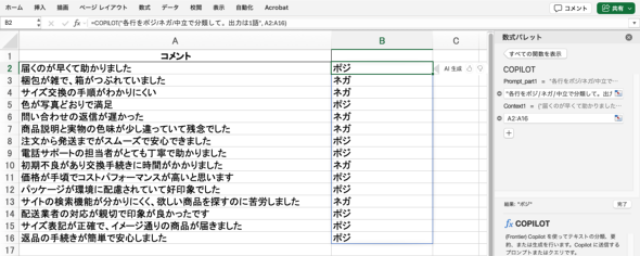 =COPILOT("各行をポジ/ネガ/中立で分類して。出力は1語", A2:A16)