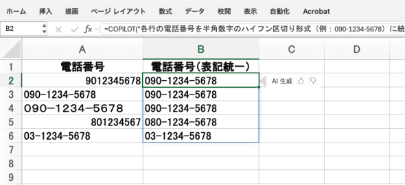 =COPILOT("各行の電話番号を半角数字のハイフン区切り形式(例:090-1234-5678)に統一してください。出力は電話番号のみ", A2:A6)