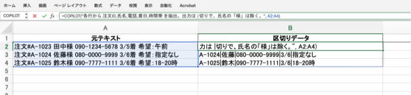 =COPILOT("各行から注文ID,氏名,電話,着日,時間帯を抽出。出力は|切りで、氏名の「様」は除く。", A2:A4)