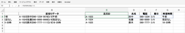 例えば、注文IDや氏名、電話番号、到着日などがテキストとして同じセル内に並んでいるものを、項目ごとに「|」(縦線)で区切るなら、隣の列に次のCopilot関数を記述する。
