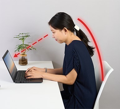 PCだけで作業をしていると、画面の位置が低くなるためどうしても猫背になりがちだ。このような無理な姿勢が続くと、肩や腕に負担がかかってしまう。