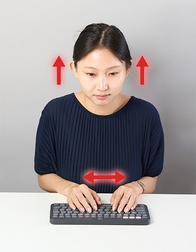 実際に一般的な形のキーボードでタイピングしている時の姿勢がこちら。両腕の間隔をキーボードに合わせて窮屈に狭めなければならず、肩の高さが上がりがちだ。肩が緊張状態になるため、猫背にもなりやすい。