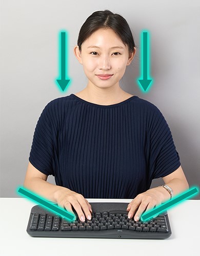 エルゴノミクスキーボードなら、腕の間隔も角度も、机に腕を置いた時の自然な状態のままでタイピングでき、肩の位置をリラックスしている時と同じ低さのまま保てる。体への負担が少なく、肩の緊張や疲れを軽減できる。