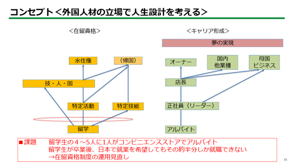 「コンビニ=外国人定着の拠点」としていきたい業界の思惑は、このイメージ図がある2ページ前、赤字で書かれた「課題」からも分かる。