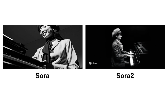 一目瞭然ですが、Soraではピアノと演奏者を同時に見せようとして、明らかにおかしな向きでピアノを弾いています。一方、Sora2では違和感なくピアノを弾いている様子が動画になっています。